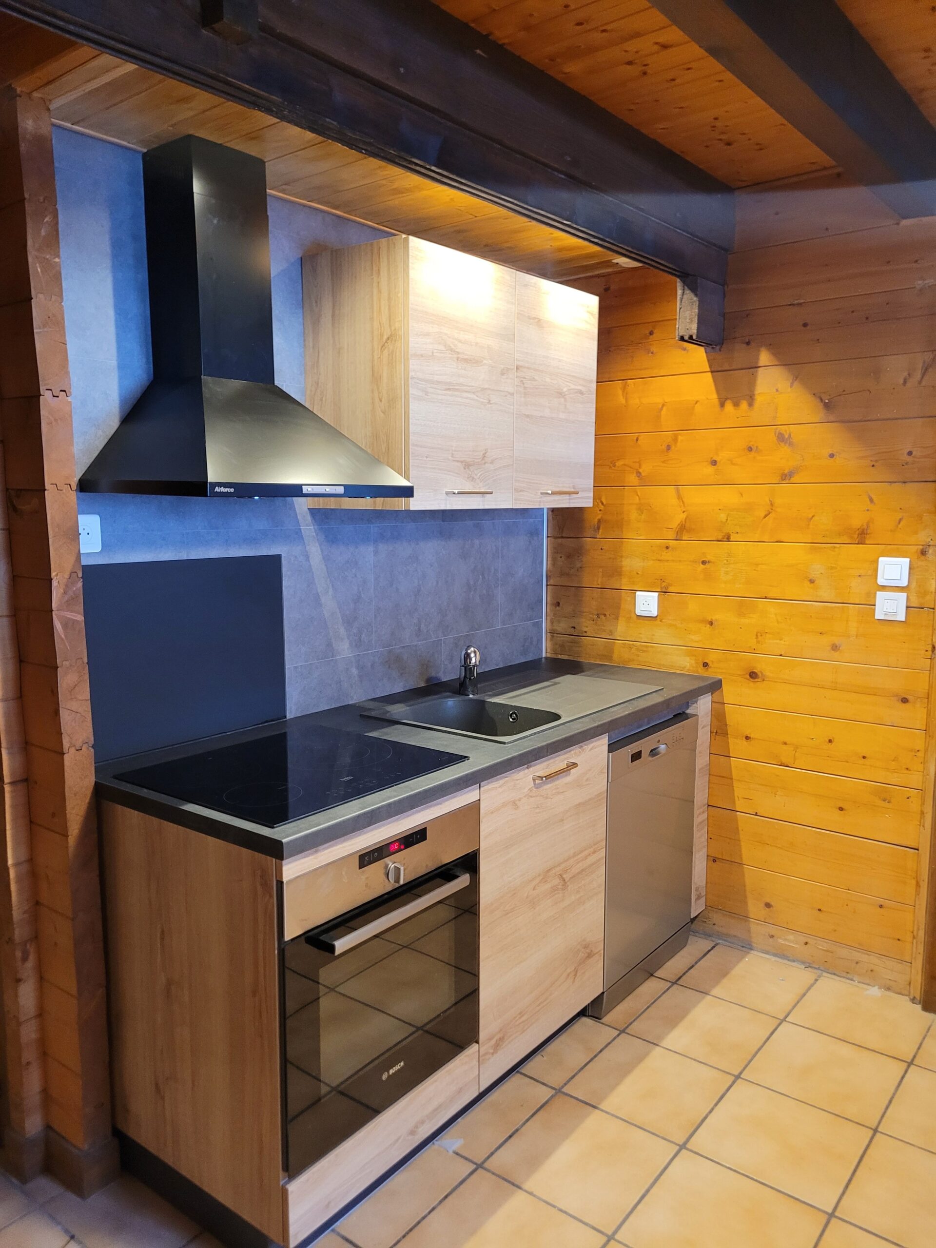 Une cuisine équipée avec four, micro-ondes, cafetière traditionnelle électrique et une cafetière pour capsules « Nespresso » (Non fournies), un lave-vaisselle.